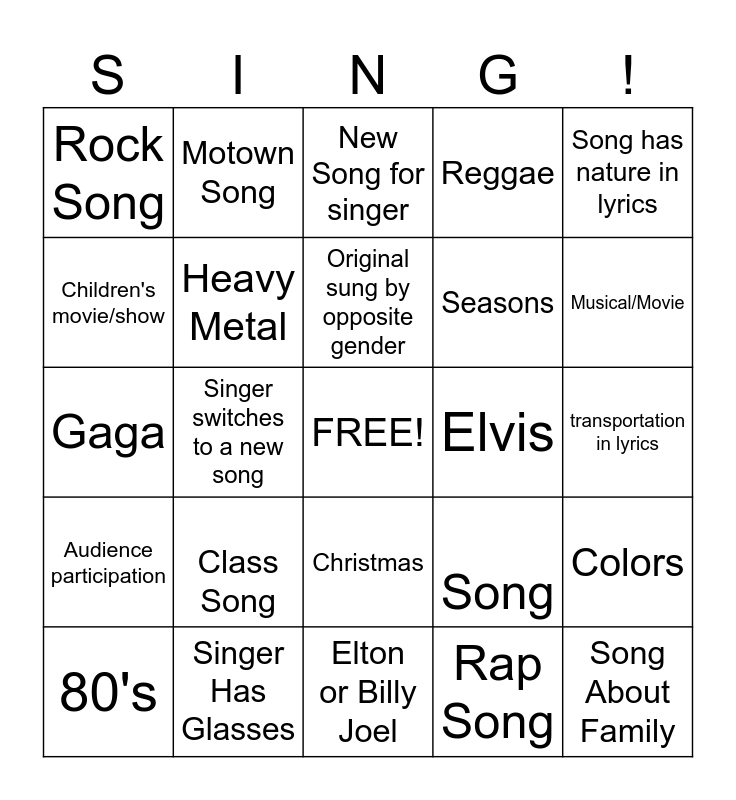 This bingo card has a free space and 34 words: Country Song, Rap Song, Singer is wearing something festive, Duet, Audience participation, Heavy Metal, Song has nature in lyrics, 80's, Motown Song, 60's-70's, Original sung by opposite gender, New Song for singer, Sexy, Yacht rock, Elvis, Musical/Movie, Singer Has Glasses, Gaga, Class Song, Song, Christmas, Funny, Rock Song, transportation in lyrics, Elton or Billy Joel, Song About Family, Reggae, Singer Dances while singing, Seasons, Children's movie/show, Prince or Bowie, Singer switches to a new song, Colors and Singer comments during song.