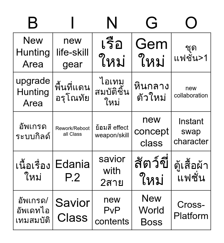 This bingo card has a free space and 24 words: Edania P.2, Savior Class, ไอเทมสมบัติชิ้นใหม่, อัพเกรด/อัพเดทไอเทมสมบัติ, ชุดแฟชั่น>1, New Hunting Area, upgrade Hunting Area, new life-skill gear, new concept class, savior with 2สาย, หินกลางตัวใหม่, อัพเกรดระบบกิลด์, สัตว์ขี่ใหม่, ตู้เสื้อผ้าแฟชั่น, พื้นที่แดนอรุโณทัย, New World Boss, Instant swap character, เรือใหม่, new collaboration, Rework/Reboot all Class, Cross-Platform, เนื้อเรื่องใหม่, Gem ใหม่ and new PvP contents.
