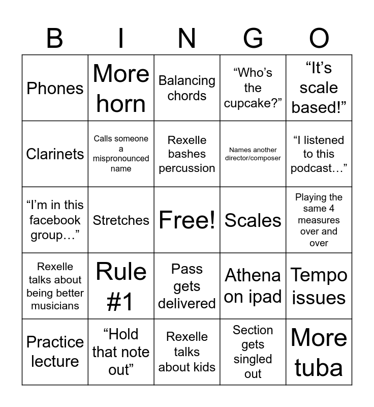 This bingo card has a free space and 24 words: Rule #1, “Hold that note out”, Rexelle bashes percussion, Practice lecture, “It’s scale based!”, Phones, Clarinets, More horn, Scales, Pass gets delivered, Names another director/composer, “I’m in this facebook group…”, Athena on ipad, Tempo issues, Calls someone a mispronounced name, Section gets singled out, Playing the same 4 measures over and over, Balancing chords, “I listened to this podcast…”, Stretches, More tuba, Rexelle talks about being better musicians, “Who’s the cupcake?” and Rexelle talks about kids.