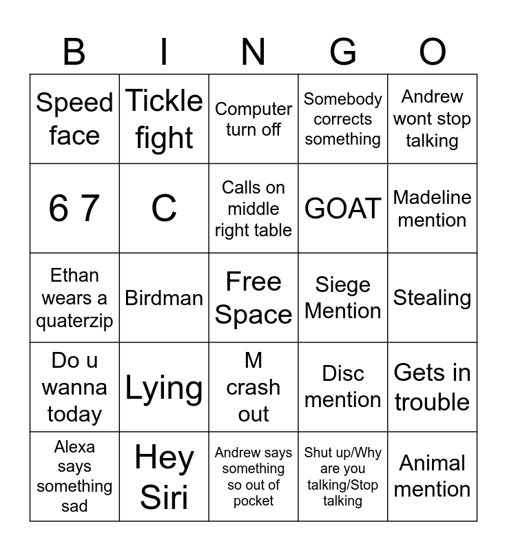 This bingo card has a free space and 29 words: Alexa says something sad, G, Birdman, Weston talks, Speed face, Computer turn off, C, Lying, Siege Mention, Hey Siri, Stealing, Animal mention, Andrew says something so out of pocket, Shut up/Why are you talking/Stop talking, Madeline mention, Parent mention, M crash out, Do u wanna today, Andrew wont stop talking, Ethan wears a quaterzip, Disc mention, FNaF mention, GOAT, 6 7, Somebody corrects something, Tickle fight, Gets in trouble, Calls on middle right table and Andrew says something that makes no sense.