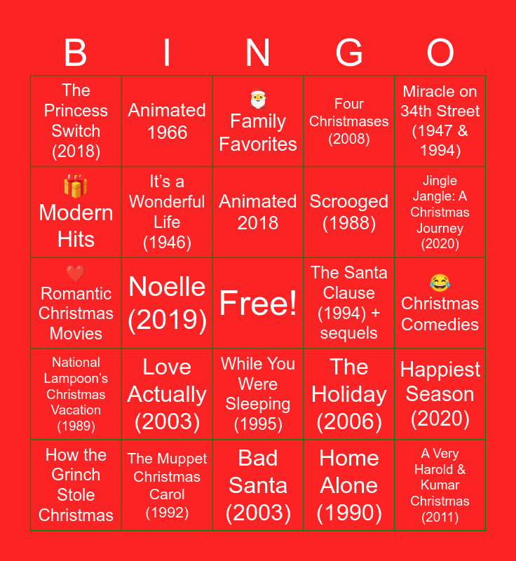 This bingo card has a free space and 34 words: 🎄 All-Time Classics, Home Alone (1990), Home Alone 2: Lost in New York (1992), A Christmas Story (1983), National Lampoon’s Christmas Vacation (1989), It’s a Wonderful Life (1946), Miracle on 34th Street (1947 & 1994), How the Grinch Stole Christmas, Animated 1966, Live-action 2000, Animated 2018, 🎅 Family Favorites, Elf (2003), The Polar Express (2004), The Santa Clause (1994) + sequels, Jingle Jangle: A Christmas Journey (2020), The Muppet Christmas Carol (1992), ❤️ Romantic Christmas Movies, Love Actually (2003), The Holiday (2006), While You Were Sleeping (1995), A Christmas Prince (2017), The Princess Switch (2018), 😂 Christmas Comedies, Bad Santa (2003), A Very Harold & Kumar Christmas (2011), Four Christmases (2008), Deck the Halls (2006), Scrooged (1988), 🎁 Modern Hits, Klaus (2019), Noelle (2019), Happiest Season (2020) and Falling for Christmas (2022).