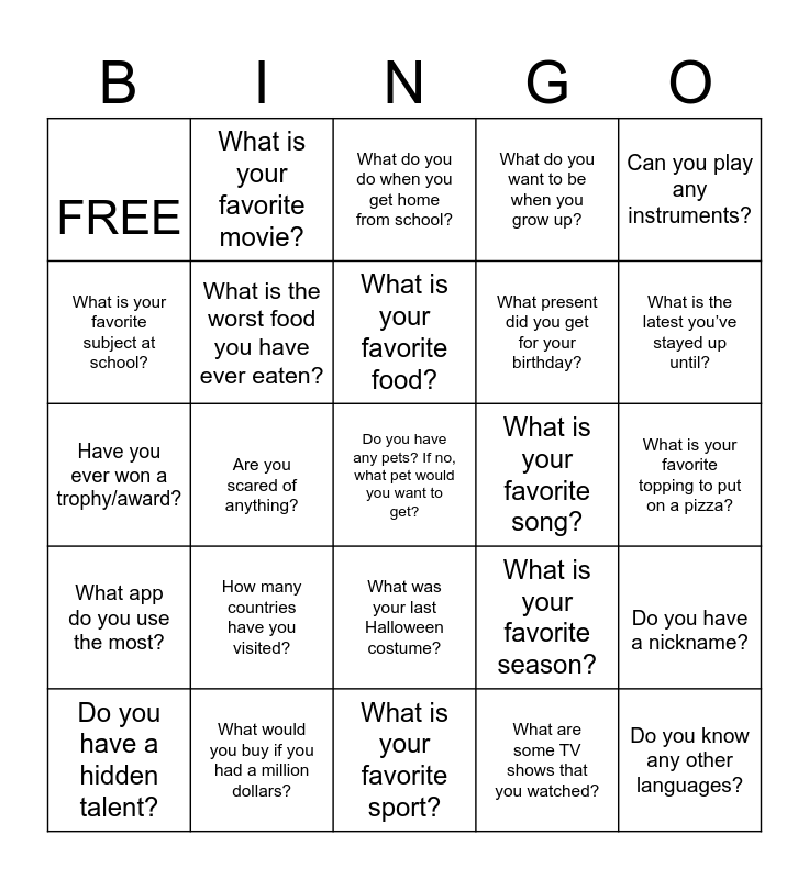 This bingo card has 25 words: How many countries have you visited?, What is your favorite sport?, What is your favorite food?, Do you have a hidden talent?, Can you play any instruments?, FREE, What is your favorite subject at school?, What is your favorite movie?, What is your favorite song?, What was your last Halloween costume?, What present did you get for your birthday?, Have you ever won a trophy/award?, What is your favorite season?, Do you have a nickname?, What is the worst food you have ever eaten?, Do you know any other languages?, What is your favorite topping to put on a pizza?, What do you do when you get home from school?, What is the latest you’ve stayed up until?, Are you scared of anything?, Do you have any pets? If no, what pet would you want to get?, What would you buy if you had a million dollars?, What app do you use the most?, What do you want to be when you grow up? and What are some TV shows that you watched?.