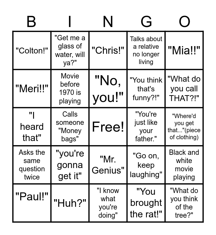 This bingo card has a free space and 24 words: "you're gonna get it", "Huh?", "No, you!", "Paul!", "Mia!!", "Colton!", "Meri!!", "Get me a glass of water, will ya?", "You're just like your father.", "Mr. Genius", "You think that's funny?!", "I heard that", "Go on, keep laughing", Black and white movie playing, Movie before 1970 is playing, "You brought the rat!", "Where'd you get that..."(piece of clothing), "Chris!", "What do you call THAT?!", Calls someone "Money bags", "What do you think of the tree?", Asks the same question twice, Talks about a relative no longer living and "I know what you're doing".