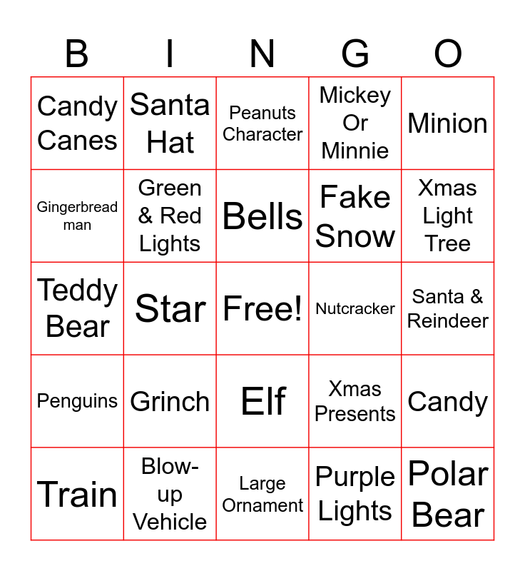 This bingo card has a free space and 29 words: Train, Projector Lights, Star, Large Wreath, Candy Canes, Peanuts Character, Green & Red Lights, Grinch, Nutcracker, Blow-up Vehicle, Santa & Reindeer, Polar Bear, Large Ornament, Purple Lights, Xmas Light Tree, Olaf, Elf, Penguins, Minion, Teddy Bear, Xmas Presents, Snowglobe, Fake Snow, Gingerbread man, Mickey Or Minnie, Santa Hat, Candy, Bells and Rudolph.