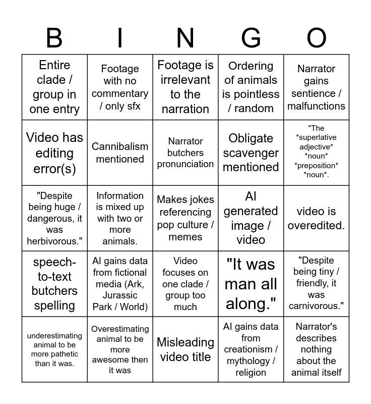 This bingo card has 25 words: AI gains data from fictional media (Ark, Jurassic Park / World), Misleading video title, Narrator butchers pronunciation, underestimating animal to be more pathetic than it was., Narrator gains sentience / malfunctions, Entire clade / group in one entry, Video has editing error(s), Footage with no commentary / only sfx, AI generated image / video, Video focuses on one clade / group too much, Obligate scavenger mentioned, "Despite being huge / dangerous, it was herbivorous.", "It was man all along.", "Despite being tiny / friendly, it was carnivorous.", Cannibalism mentioned, Narrator's describes nothing about the animal itself, video is overedited., Footage is irrelevant to the narration, "The *superlative adjective* *noun* *preposition* *noun*., Information is mixed up with two or more animals., Makes jokes referencing pop culture / memes, Overestimating animal to be more awesome then it was, speech-to-text butchers spelling, Ordering of animals is pointless / random and AI gains data from creationism / mythology / religion.