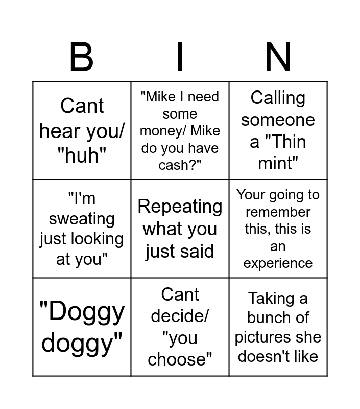 This bingo card has a free space and 15 words: "Are you making fun of me?", Arguing with Jen/ Lisa, Calling someone a "Thin mint", Cant hear you/ "huh", Cant decide/ "you choose", Taking a bunch of pictures she doesn't like, "I don't know how to do...", Telling mike to do something for her, Your going to remember this, this is an experience, Tapping her glass for a refill, "I cant hear you", "I'm sweating just looking at you", "Doggy doggy", "Mike I need some money/ Mike do you have cash?" and "When I was younger/ When I had kids".