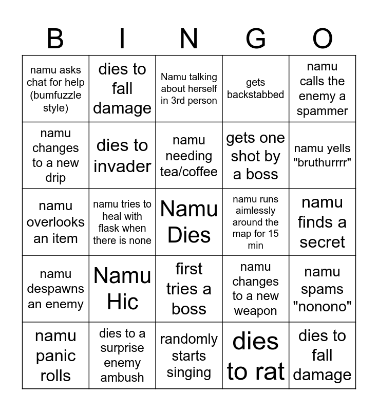 This bingo card has a free space and 24 words: Namu Hic, dies to a surprise enemy ambush, namu needing tea/coffee, namu panic rolls, namu calls the enemy a spammer, namu asks chat for help (bumfuzzle style), namu changes to a new drip, dies to fall damage, namu runs aimlessly around the map for 15 min, first tries a boss, gets one shot by a boss, namu overlooks an item, namu changes to a new weapon, namu spams "nonono", dies to invader, dies to rat, namu finds a secret, Namu talking about herself in 3rd person, namu yells "bruthurrrr", namu tries to heal with flask when there is none, dies to fall damage, namu despawns an enemy, gets backstabbed and randomly starts singing.
