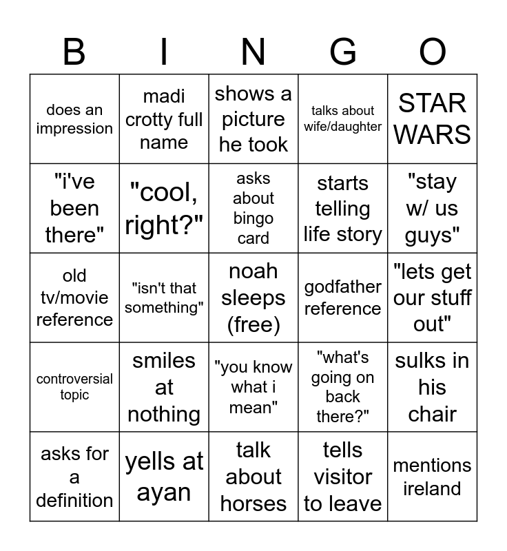 This bingo card has a free space and 29 words: asks for a definition, "okay?", "isn't that something", dad joke, does an impression, shows a picture he took, "cool, right?", smiles at nothing, godfather reference, yells at ayan, "lets get our stuff out", mentions ireland, talk about horses, tells visitor to leave, "stay w/ us guys", argues with rebecca, "you know what i mean", controversial topic, STAR WARS, old tv/movie reference, "what's going on back there?", tells sophia to sit down, starts telling life story, "i've been there", talks about wife/daughter, madi crotty full name, sulks in his chair, asks about bingo card and fake punches.