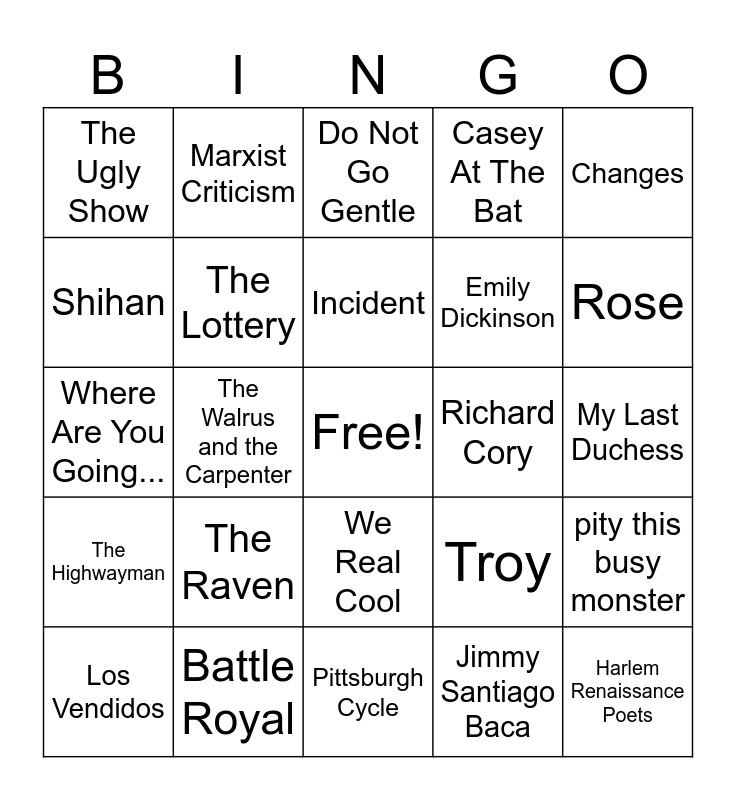 This bingo card has 40 words: Cask of Amontillado, Where Are You Going..., The Yellow Wallpaper, The Lottery, Battle Royal, We Real Cool, Incident, Harlem, Changes, The Highwayman, The Walrus and the Carpenter, Casey At The Bat, Free!, My Last Duchess, Richard Cory, The Raven, Lose Yourself, The Ugly Show, Poetri, Do Not Go Gentle, pity this busy monster, Jimmy Santiago Baca, Emily Dickinson, Shihan, Elements of Voice, Elements of Style, Elements of Language, Narrative Poetry, Harlem Renaissance Poets, Internal Rhyme, Luis Valdez, Los Vendidos, August Wilson, Troy, Rose, Pittsburgh Cycle, Psychoanalysis, Feminist Criticism, Marxist Criticism and New Historicism.