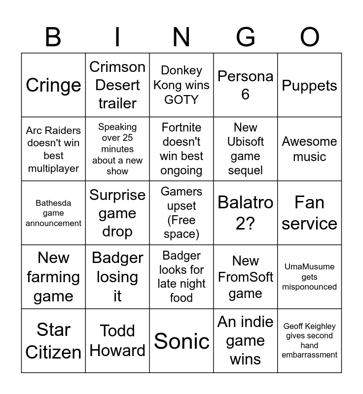 This bingo card has a free space and 77 words: Clair Obscur Wins GOTY, Clair Obscur doesn't win best indie, Donkey Kong wins GOTY, Death Stranding 2 wins GOTY, Badger falls asleep, Badger hyped, Badger complains a lot, Obnoxious winning speech, Silksong wins GOTY, Kingdom Come wins GOTY, Hades 2 wins GOTY, Clair Obscur wins more than 3 categories, Fortnite doesn't win best ongoing, Arc Raiders doesn't win best multiplayer, GTA 6 trailer, Surprise game drop, Surprise dlc drop, Geoff Keighley gives second hand embarrassment, Celebrity as special guest, Puppets, Celebrity badger doesn't recognize as special geust, Bathesda game announcement, Speaking over 25 minutes about a new show, Crimson Desert trailer, Persona 6, Persona 4 remake, New Final Fantasy game, Reviving a dead Franchise, Zombies, Dragons, More extraction shooters, New hero shooter, Bloodborne 2, New FromSoft game, Awesome music, New Ubisoft game sequel, Space!, Praising Kojima, Fan service, An indie game wins, Beyond Good and Evil Trailer, New console, Blizzard attempts, Fable 4, Half Life 3, Orange box 2, Star Citizen, Cringe, Meme references, Monster Hunter wins rpg of the year, Badger groans. A lot, Badger looks for late night food, Badger drinks more than 2 cups of coffee, Very long badger rant that goes nowhere, Badger randomly says Smash, New Smash game, Fire Emblem mentioned, Warhammer mentioned, Warframe/soulframe mentioned, Cats, Badger losing it, More than 2 non-game trailers, New co-op slop, Flute guy, Sequel no one asked for, Badger gets bored - starts playing games, Okami, Balatro 2?, Silksong doesn't win anything, Gabe Newell, More than 3 anime games, UmaMusume gets misponounced, New farming game, Todd Howard, Kingdom Hearts 4, Sonic and A remake no one asked for.
