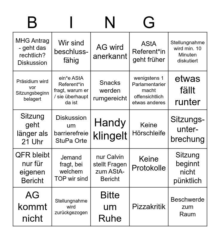 This bingo card has 25 words: Jemand fragt, bei welchem TOP wir sind, Bitte um Ruhe, Snacks werden rumgereicht, AG kommt nicht, Stellungnahme wird min. 10 Minuten diskutiert, MHG Antrag - geht das rechtlich? Diskussion, Präsidium wird vor Sitzungsbeginn belagert, Wir sind beschluss-fähig, Keine Hörschleife, nur Calvin stellt Fragen zum AStA-Bericht, wenigstens 1 Parlamentarier macht offensichtlich etwas anderes, Sitzung geht länger als 21 Uhr, Keine Protokolle, Sitzung beginnt nicht pünktlich, ein*e AStA Referent*in fragt, warum er / sie überhaupt da ist, Beschwerde zum Raum, Sitzungs-unter-brechung, AG wird anerkannt, etwas fällt runter, Diskussion um barrierefreie StuPa Orte, Handy klingelt, Stellungnahme wird zurückgezogen, QFR bleibt nur für eigenen Bericht, AStA Referent*in geht früher and Pizzakritik.