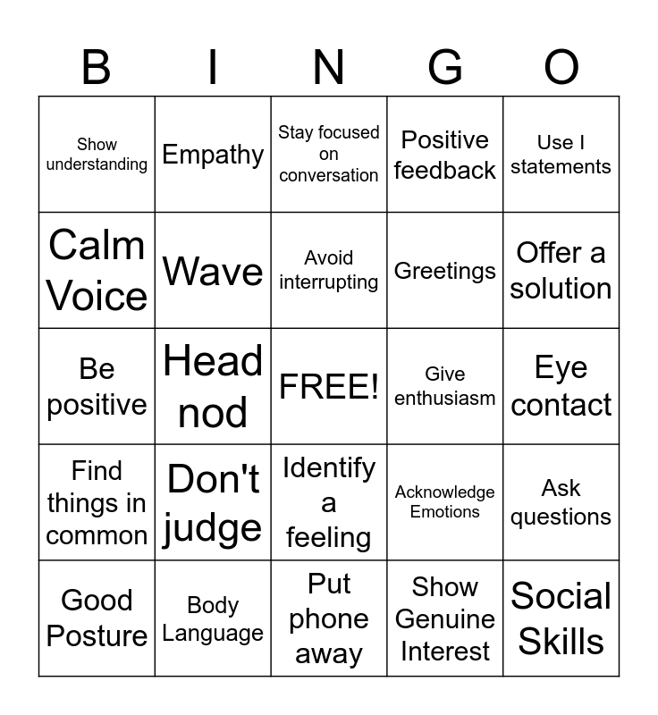 This bingo card has a free space and 24 words: Don't judge, Body Language, Avoid interrupting, Good Posture, Use I statements, Show understanding, Calm Voice, Empathy, Give enthusiasm, Identify a feeling, Greetings, Be positive, Acknowledge Emotions, Ask questions, Wave, Show Genuine Interest, Eye contact, Stay focused on conversation, Offer a solution, Head nod, Social Skills, Find things in common, Positive feedback and Put phone away.
