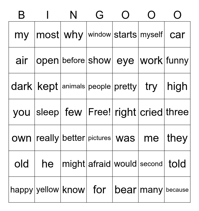 This bingo card has a free space and 49 words: second, work, bear, sleep, animals, three, most, know, myself, pictures, car, window, try, pretty, he, cried, air, funny, told, starts, eye, few, my, open, happy, before, high, yellow, people, kept, go, right, old, might, you, was, me, they, dark, better, afraid, own, because, for, show, why, would, really and many.
