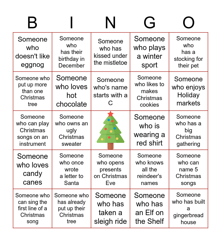 This bingo card has a free space and 24 words: Someone who once wrote a letter to Santa, Someone who has already put up their Christmas tree, Someone who's name starts with a C, Someone who can sing the first line of a Christmas song, Someone who has a stocking for their pet, Someone who doesn't like eggnog, Someone who put up more than one Christmas tree, Someone who has their birthday in December, Someone who is wearing a red shirt, Someone who opens presents on Christmas Eve, Someone who likes to makes Christmas cookies, Someone who can play Christmas songs on an instrument, Someone who knows all the reindeer's names, Someone who can name 5 Christmas songs, Someone who loves hot chocolate, Someone who has an Elf on the Shelf, Someone who has a big Christmas gathering, Someone who has kissed under the mistletoe, Someone who enjoys Holiday markets, Someone who owns an ugly Christmas sweater, Someone who has built a gingerbread house, Someone who loves candy canes, Someone who plays a winter sport and Someone who has taken a sleigh ride.