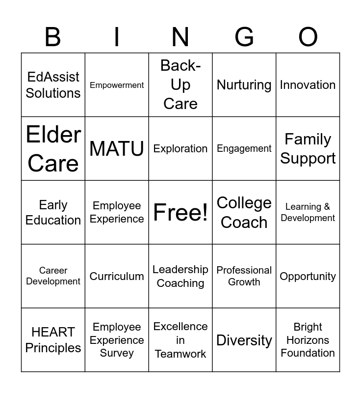 This bingo card has a free space and 29 words: HEART Principles, Community, Employee Experience, Collaboration, EdAssist Solutions, Back-Up Care, MATU, Curriculum, College Coach, Employee Experience Survey, Learning & Development, Bright Horizons Foundation, Excellence in Teamwork, Diversity, Family Support, Inclusion, Leadership Coaching, Career Development, Innovation, Early Education, Professional Growth, Support, Engagement, Elder Care, Nurturing, Empowerment, Opportunity, Exploration and Creativity.