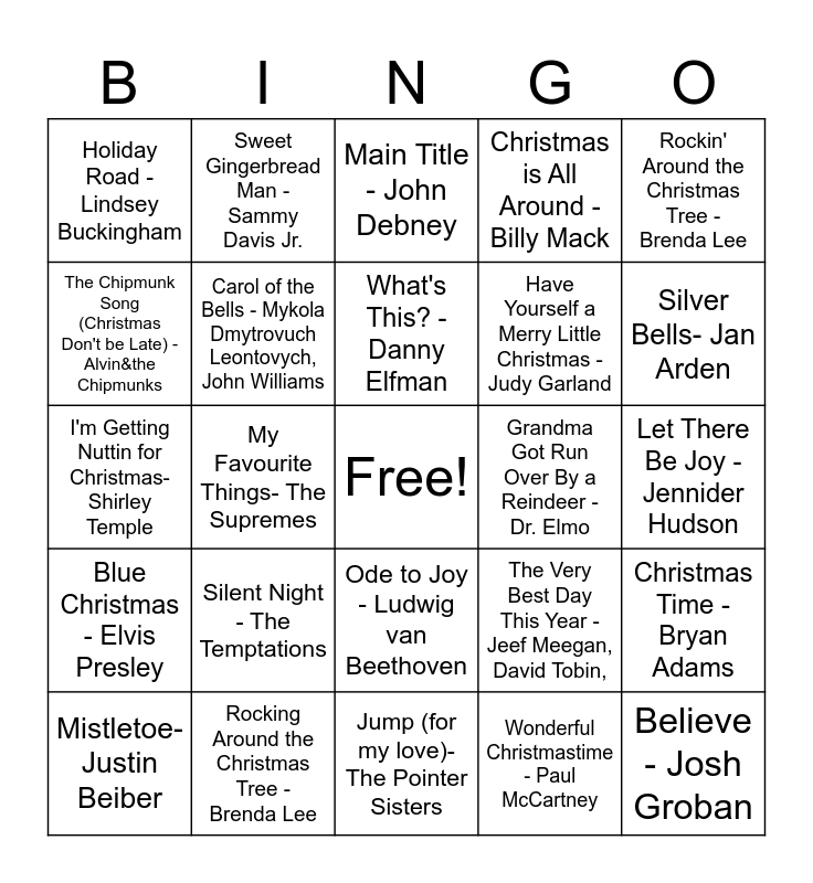 This bingo card has a free space and 59 words: Little Saint Nick- The Beach Boys, Rocking Around the Christmas Tree - Brenda Lee, Jingle Bells- Frank Sinatra, Blue Christmas - Elvis Presley, Wonderful Christmastime - Paul McCartney, Christmas Time is Here - Vince Guaradi Trio, Carol of the Bells - Mykola Dmytrovuch Leontovych, John Williams, What Christmas Means to me - Hanson, Have Yourself a Merry Little Christmas - Judy Garland, You're a Mean One, Mr. Grinch - Thurl Ravenscroft, Christmas is All Around - Billy Mack, Candy Cane Lane - Sia, The Chipmunk Song (Christmas Don't be Late) - Alvin&the Chipmunks, Do you Want to Build a Snowman? - Kristen Bell, Making Christmas - The Citizens of Halloween, Danny Elfman, Holiday Road - Lindsey Buckingham, Believe - Josh Groban, Rockin' Around the Christmas Tree - Brenda Lee, Thankful Heart- Scrooge, What's This? - Danny Elfman, Grandma Got Run Over By a Reindeer - Dr. Elmo, Main Title - John Debney, Mistletoe- Justin Beiber, Christmas Time - Bryan Adams, O Holy Night - Celine Dion, River - Joni Mitchell, Driving Home or Christmas - Jonathan Roy, Corey Hart, Wintersong- Sarah McLachlan, Silver Bells- Jan Arden, Step into Christmas - Elton John, Cool Yule- Louis Armstrong, The Commanders, Wrapped in Red - Kelly Clarkson, What Christmas Means to Me- Stevie Wonder, I've got my Love to Keep Me Warm - Kay Starr, Stuhr, Sweet Gingerbread Man - Sammy Davis Jr., Frosty the Snowman - Ella Fitzgerald, I am the Grinch - Tyler the Creator, Fletcher Jones, My Favourite Things- The Supremes, Home for the Holidays - Pentatonix, I'm Getting Nuttin for Christmas- Shirley Temple, The Nutcracker Suite (Russian Dance) - Pyotr Ilyich Tchaikovsky, Silent Night - The Temptations, Let There Be Joy - Jennider Hudson, Christmas in Hollis - Run D.M.C, Rudolph the Red Nosed Reindeer - Burl Ives, You're a Mean One, Mr. Grinch - Thurl Ravenscroft, Boris Karloff, I Want a Hippopotamus for Christmas - Gayla Peevey, O Tannenbaum - Vince Guaraldi Trio, Ode to Joy - Ludwig van Beethoven, Jump (for my love)- The Pointer Sisters, Underneath the Tree - Kelly Clarkson, Have Yourself a Merry Little Christmas - Judy Garland, Run Run Rudolph- Mark Ambor, Christmas Tree Farm - Taylor Swift, Winter Winds - Mumford & Sons, The Very Best Day This Year - Jeef Meegan, David Tobin,, Linus and Lucy - Vince Guaraldi, That Holiday Feelin - Mr. and Mrs. and Peanuts - Holywood Classic Themes.
