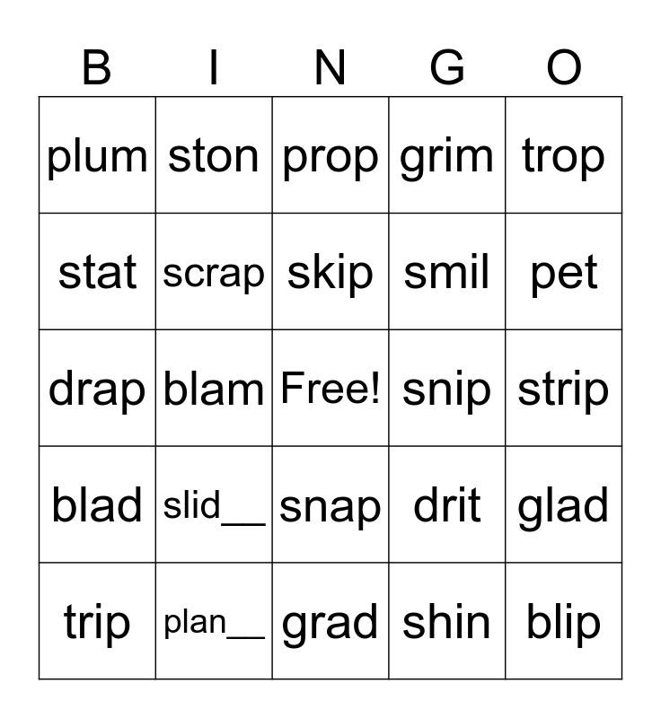 This bingo card has a free space and 24 words: slid__, plan__, skip, trip, trop, plum, stat, ston, snip, snap, smil, drap, drit, glad, scrap, shin, strip, prop, pet, blam, blip, blad, grim and grad.