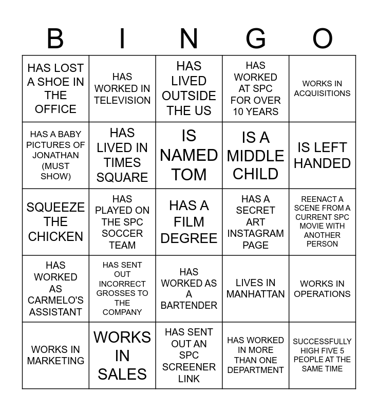 This bingo card has 35 words: Free!, TAKE A SHOT, HAS HIT MB WITH A CAR, HAS LIVED IN TIMES SQUARE, HAS WORKED AS A BARTENDER, HAS WORKED AT SPC FOR OVER 10 YEARS, HAS A BABY PICTURES OF JONATHAN (MUST SHOW), DOES NOT LIVE IN NEW YORK, IS NAMED TOM, HAS 500+ UNREAD EMAILS (MUST SHOW), SQUEEZE THE CHICKEN, WORKS IN ACQUISITIONS, TEXT KAITLYN (MUST GET A RESPONSE), PUNCH JONATHAN, HAS LOST A SHOE IN THE OFFICE, HAS A SECRET ART INSTAGRAM PAGE, HAS WORKED IN MORE THAN ONE DEPARTMENT, HAS PLAYED ON THE SPC SOCCER TEAM, HAS WORKED AS CARMELO'S ASSISTANT, HAS A FILM DEGREE, LIVES IN MANHATTAN, WORKS IN MARKETING, WORKS IN OPERATIONS, WORKS IN SALES, HAS LIVED OUTSIDE THE US, IS LEFT HANDED, SUCCESSFULLY HIGH FIVE 5 PEOPLE AT THE SAME TIME, HAS A DECEMBER BIRTHDAY, IS A MIDDLE CHILD, REENACT A SCENE FROM A CURRENT SPC MOVIE WITH ANOTHER PERSON, HAS ATTENDED THE OSCARS, HAS SENT OUT AN SPC SCREENER LINK, HAS SENT OUT INCORRECT GROSSES TO THE COMPANY, HAS WORKED IN TELEVISION and RAN A FILM CLUB IN COLLEGE.