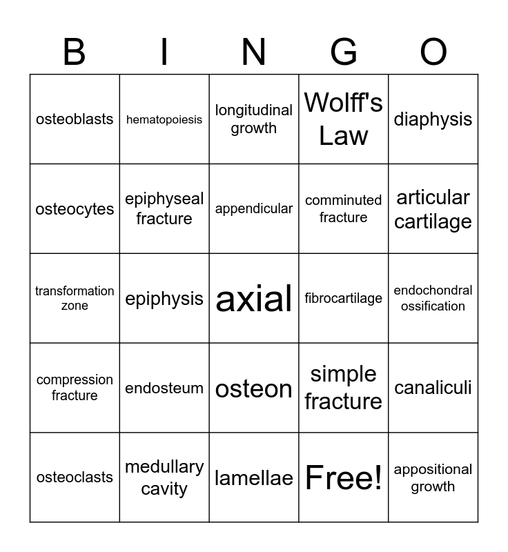 This bingo card has 30 words: medullary cavity, elastic cartilage, epiphysis, epiphyseal plate/line, osteoblasts, longitudinal growth, epiphyseal fracture, osteon, fibrocartilage, lamellae, endochondral ossification, axial, Free!, appositional growth, articular cartilage, displaced fracture, simple fracture, compression fracture, endosteum, diaphysis, transformation zone, periosteum, hematopoiesis, comminuted fracture, osteocytes, Wolff's Law, canaliculi, osteoclasts, appendicular and osteogenic zone.