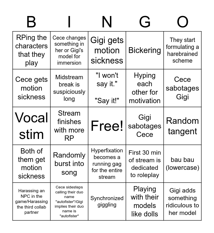 This bingo card has a free space and 24 words: Randomly burst into song, Cece sidesteps calling their duo name "autofister"/Gigi implies their duo name is "autofister", "I won't say it." "Say it!", Harassing an NPC in the game/Harassing the third collab partner, They start formulating a harebrained scheme, RPing the characters that they play, Cece gets motion sickness, Cece changes something in her or Gigi's model for immersion, Gigi sabotages Cece, Hyperfixation becomes a running gag for the entire stream, Hyping each other for motivation, Vocal stim, First 30 min of stream is dedicated to roleplay, bau bau (lowercase), Midstream break is suspiciously long, Playing with their models like dolls, Random tangent, Gigi gets motion sickness, Cece sabotages Gigi, Stream finishes with more RP, Gigi adds something ridiculous to her model, Both of them get motion sickness, Bickering and Synchronized giggling.