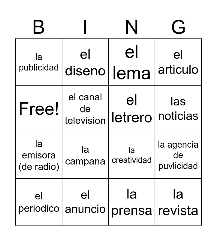 This bingo card has 16 words: el anuncio, la agencia de puvlicidad, el lema, la publicidad, la emisora (de radio), el diseno, la creatividad, la prensa, Free!, el canal de television, el periodico, el articulo, la campana, las noticias, el letrero and la revista.