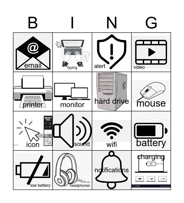 This bingo card has 24 images and 24 words: desktop, laptop, mouse, keyboard, printer, email, monitor, typing, headphones, phishing, icon, wifi, security, usb, hard drive, Windows, notifications, alert, sound, battery, low battery, charging, video and gaming.