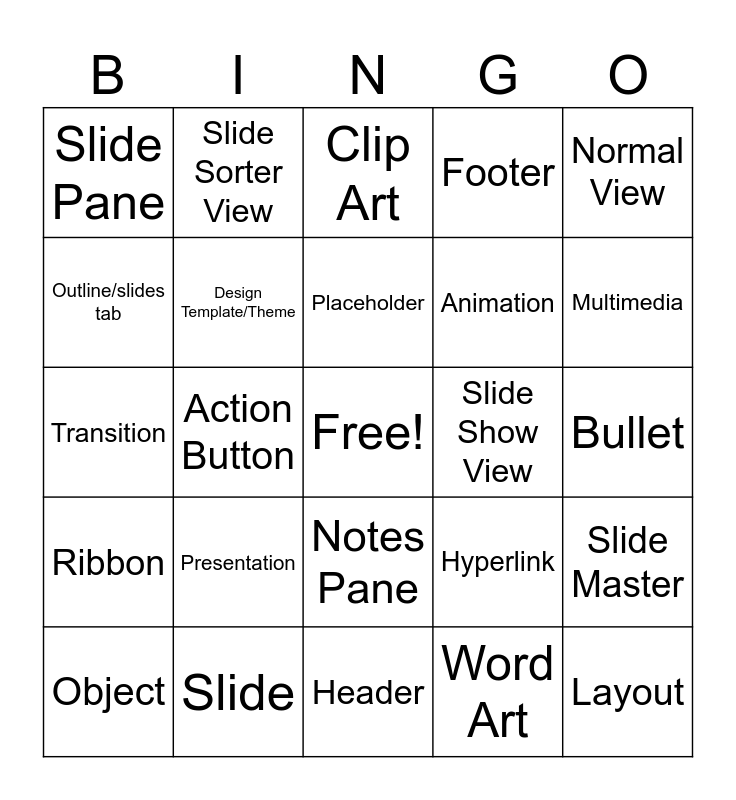 This bingo card has a free space and 24 words: Presentation, Slide, Placeholder, Object, Normal View, Slide Pane, Outline/slides tab, Slide Sorter View, Slide Show View, Notes Pane, Animation, Transition, Hyperlink, Slide Master, Design Template/Theme, Word Art, Bullet, Clip Art, Multimedia, Action Button, Layout, Ribbon, Footer and Header.