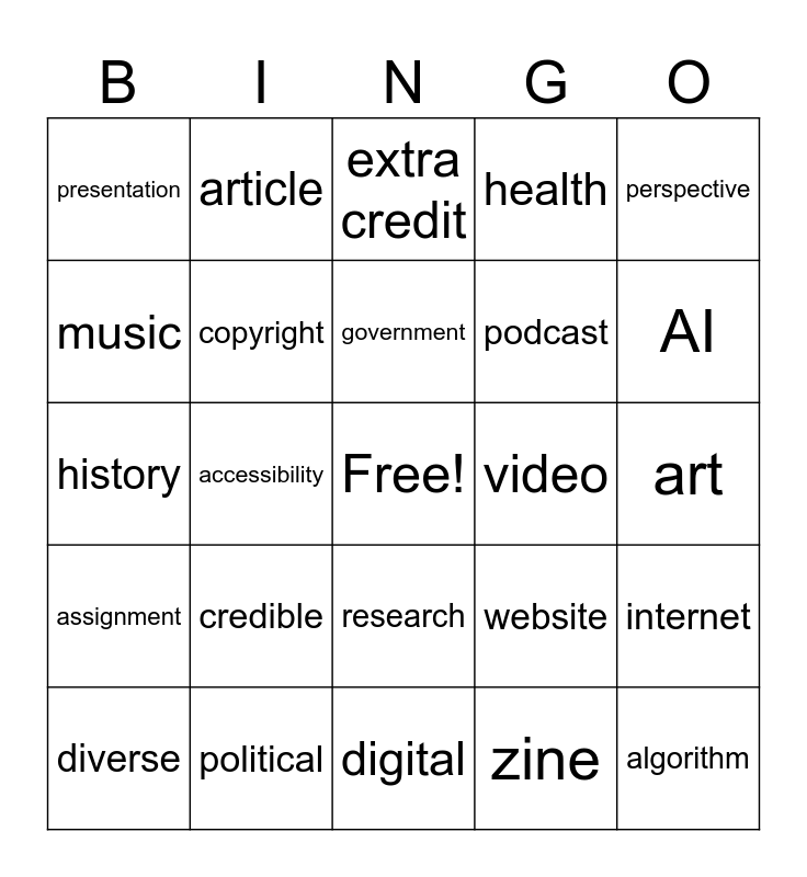 This bingo card has a free space and 31 words: digital, books, accessibility, scholarly, presentation, extra credit, copyright, website, video, zine, art, algorithm, social media, censorship, AI, misinformation, internet, credible, assignment, research, perspective, challenge, diverse, article, podcast, music, health, history, political, government and privacy.