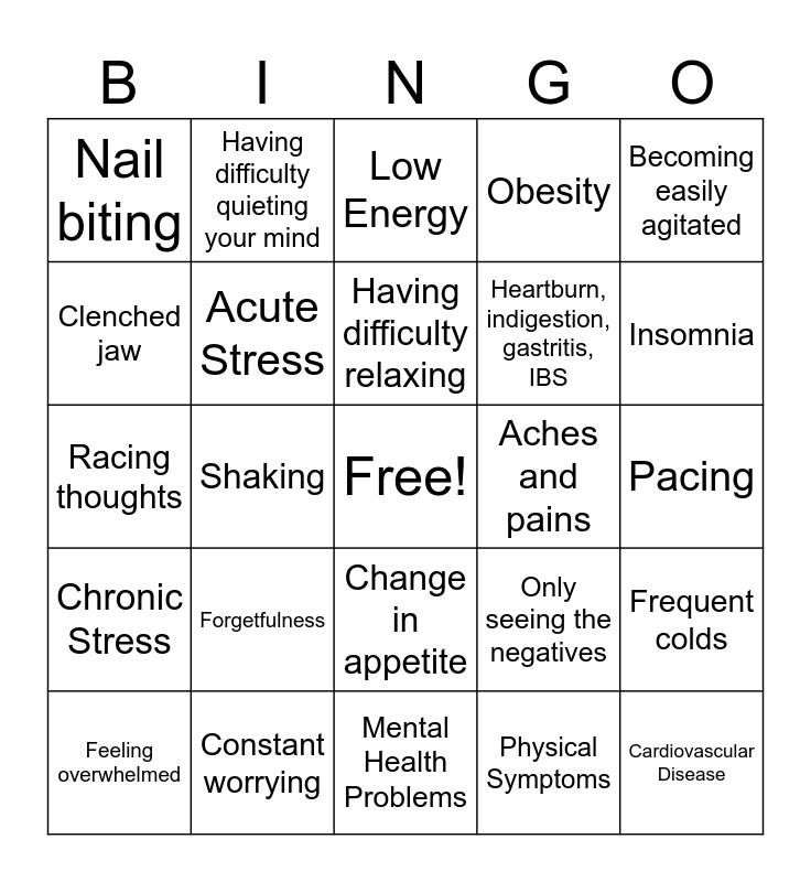 This bingo card has a free space and 34 words: Emotional symptoms, Physical Symptoms, Cognitive Symptoms, Behavioral Symptoms, Chronic Stress, Acute Stress, Becoming easily agitated, Feeling overwhelmed, Having difficulty quieting your mind, Avoiding others, Having difficulty relaxing, Low Energy, Headaches, Upset stomach, Aches and pains, Insomnia, Constant worrying, Racing thoughts, Forgetfulness, Only seeing the negatives, Change in appetite, Avoiding responsibilities, Nail biting, Pacing, Mental Health Problems, Cardiovascular Disease, Obesity, Skin and hair problems, Heartburn, indigestion, gastritis, IBS, Clenched jaw, Cold or sweaty hands or feet, Shaking, Frequent colds and Rapid Heartrate.