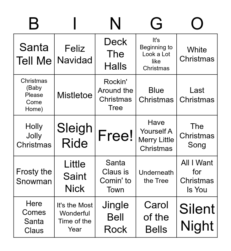 This bingo card has a free space and 28 words: All I Want for Christmas Is You, Baby It’s Cold Outside, Blue Christmas, Carol of the Bells, Christmas (Baby Please Come Home), Deck The Halls, Feliz Navidad, Frosty the Snowman, Have Yourself A Merry Little Christmas, Here Comes Santa Claus, Holly Jolly Christmas, It's Beginning to Look a Lot like Christmas, It's the Most Wonderful Time of the Year, Jingle Bell Rock, Last Christmas, Let It Snow! Let It Snow! Let It Snow!, Little Saint Nick, Mistletoe, Rockin' Around the Christmas Tree, Santa Claus is Comin' to Town, Santa Tell Me, Santa, Can't You Hear Me, Silent Night, Sleigh Ride, The Christmas Song, Underneath the Tree, White Christmas and Winter Wonderland.