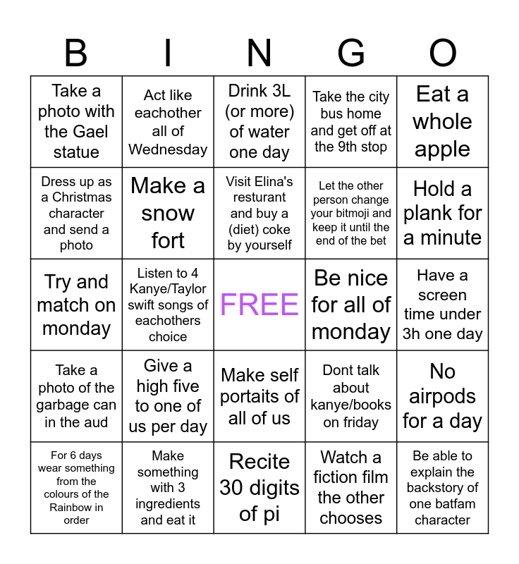This bingo card has a free space and 24 words: Give a high five to one of us per day, Make something with 3 ingredients and eat it, Visit Elina's resturant and buy a (diet) coke by yourself, For 6 days wear something from the colours of the Rainbow in order, Eat a whole apple, Take a photo with the Gael statue, Dress up as a Christmas character and send a photo, Act like eachother all of Wednesday, Be nice for all of monday, Make self portaits of all of us, Let the other person change your bitmoji and keep it until the end of the bet, Try and match on monday, Dont talk about kanye/books on friday, No airpods for a day, Make a snow fort, Watch a fiction film the other chooses, Have a screen time under 3h one day, Drink 3L (or more) of water one day, Hold a plank for a minute, Listen to 4 Kanye/Taylor swift songs of eachothers choice, Be able to explain the backstory of one batfam character, Take a photo of the garbage can in the aud, Take the city bus home and get off at the 9th stop and Recite 30 digits of pi.