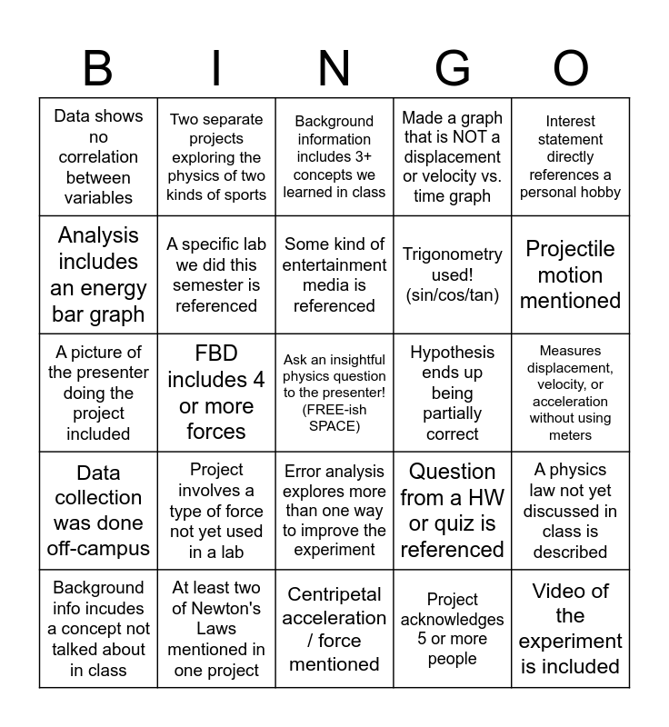 This bingo card has a free space and 39 words: Used a force equation we didn't use in class, Solution for a variable includes the number 67, Both static and kinetic friction mentioned in one project, A specific lab we did this semester is referenced, Background info incudes a concept not talked about in class, Error analysis explores more than one way to improve the experiment, Some kind of entertainment media is referenced, Project slides use slide animation, Interest statement directly references a personal hobby, Data collection was done off-campus, FBD includes 4 or more forces, Made a graph that is NOT a displacement or velocity vs. time graph, Video of the experiment is included, Measures displacement, velocity, or acceleration without using meters, Hypothesis ends up being partially correct, Project involves a type of force not yet used in a lab, Linear regression / best fit line used in analysis, Data shows no correlation between variables, Graph includes 10 or more points per data set, Question from a HW or quiz is referenced, Analysis includes an energy bar graph, Centripetal acceleration / force mentioned, Trigonometry used! (sin/cos/tan), Projectile motion mentioned, Work energy theorem mentioned, Background information cites a source from the web / a book, Project uses temperature in some capacity, The analysis supports the opposite of the hypothesis, Analysis includes 3+ graphs, Two separate projects exploring the physics of two kinds of sports, v = d/t or a = v/t is used in calculations, Object analyzed in experiment is in static equilibrium, Background information includes 3+ concepts we learned in class, At least two of Newton's Laws mentioned in one project, Project acknowledges 5 or more people, MISSING UNITS!!! (Old habits die hard?), A physics law not yet discussed in class is described, A picture of the presenter doing the project included and Single graph includes 3 or more sets of data.