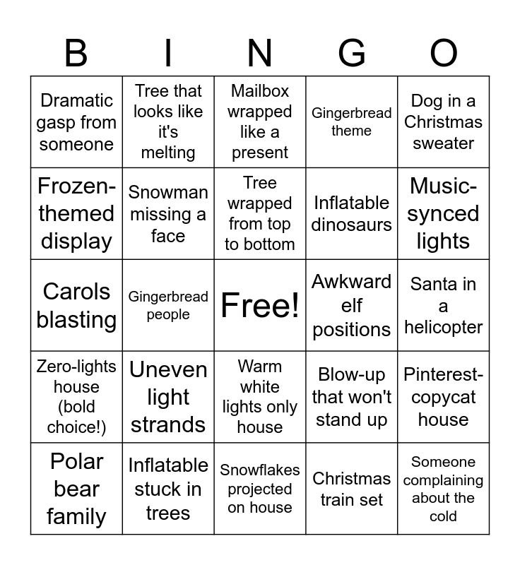 This bingo card has a free space and 105 words: Giant inflatable Santa, House that gave up halfway, Dog in a Christmas sweater, Reindeer pulling a sleigh, Someone yelling “SLOW DOWN!”, Griswold-level house, Blue lights everywhere, Animated LED snowflakes, Baby Yoda/Grogu décor, Someone sings along loudly, Candy cane driveway, Grinch stealing lights, House blasting music, Tree only decorated on one side, Inflatable Minions, Awkwardly placed inflatable, Mailbox wrapped like a present, Random penguin, Homemade wooden décor, Driveway blocked by lookers, Snowman family, “Ditto →” sign, Someone says “This one’s my favorite!”, Inflatable reindeer too big for yard, Nativity scene, Uneven light strands, Music-synced lights, Gingerbread theme, House outlined in one color, Someone misidentifies décor, Blow-up that won't stand up, Christmas train set, Snowglobes or light-up spheres, Overly aggressive holiday sign, Blinking lights that feel personal, Someone narrating the tour, Car honks due to stopping too long, Elf décor, Tree wrapped from top to bottom, Inflatable stuck in trees, Yard that looks like Hobby Lobby exploded, Zero-lights house (bold choice!), Santa stuck in a chimney, Frozen-themed display, House that is too bright, Dramatic gasp from someone, Oversized candy canes, Someone complaining about the cold, Rudolph sighting, Blow-up archway, Mismatched color lights, Holiday projector lights, Someone taking photos in the street, Nativity with extra random animals, Santa climbing a ladder, Mickey or Minnie holiday décor, Decoration that makes no sense, Blow-up Grinch, Light-up penguins, Warm white lights only house, Santa in a helicopter, “Electric bill” comment, Present light boxes, Oversized wreath, Candy cane walkway, Confusing theme house, Christmas unicorn, Tree that looks like it's melting, Carols blasting, Gingerbread people, Snowflakes projected on house, Santa on a motorcycle, Candy cane missing its top, Group member shivering, Winter gnome, Only one string of lights house, Inflatable sideways or collapsed, Someone says “That's extra”, Polar bear family, Photo-op backdrop, Maze-like yard décor, Garage door display, Icicle lights, Snowman missing a face, Inflatable that's way too tall, Awkward elf positions, Perfectly symmetrical yard, Lights wrapped around a random object, Glitter-shedding wreath, Rudolph with fading nose, Tiny inflatables, Fully wrapped tree, Santa waving, Multicolor light chaos, Pinterest-copycat house, Someone quoting Elf, Driveway light tunnel, One sad wreath house, Inflatable dinosaurs, Metallic tinsel décor, Flickering strand of lights, Star on the roof, Face-planted inflatable, Santa and the Grinch together and Mailbox covered in lights.