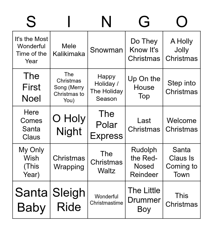This bingo card has 35 words: Baby, It's Cold Outside, Blue Christmas, The Chimpunk Song, The Christmas Song (Merry Christmas to You), The Christmas Waltz, Do They Know It's Christmas, The First Noel, Grandma Got Run Over By a Reindeer, Happy Holiday / The Holiday Season, Have Yourself a Memory Little Christmas, Here Comes Santa Claus, A Holly Jolly Christmas, I Saw Mommy Kissing Santa Claus, Jingle Bells, It's the Most Wonderful Time of the Year, Last Christmas, The Little Drummer Boy, O Holy Night, My Only Wish (This Year), The Polar Express, Rudolph the Red-Nosed Reindeer, Santa Baby, Santa Claus Is Coming to Town, Sleigh Ride, Snowman, Step into Christmas, This Christmas, The Twelve Days of Christmas, Up On the House Top, Welcome Christmas, White Christmas, Wonderful Christmastime, Christmas Wrapping, Mele Kalikimaka and Merry Christmas, Happy Holidays.
