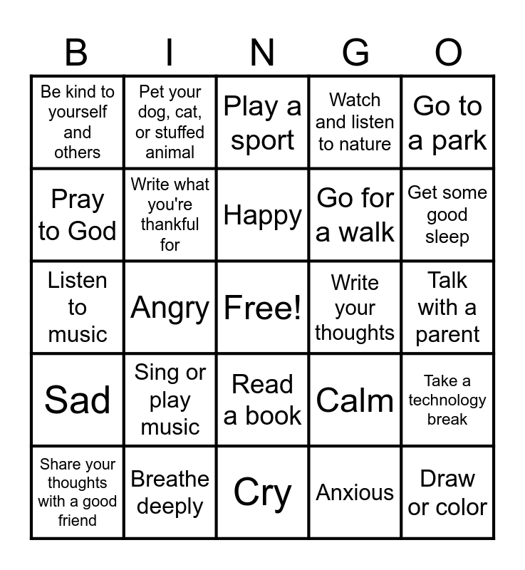 This bingo card has a free space and 24 words: Sing or play music, Breathe deeply, Happy, Share your thoughts with a good friend, Go to a park, Be kind to yourself and others, Pray to God, Pet your dog, cat, or stuffed animal, Write your thoughts, Read a book, Go for a walk, Listen to music, Calm, Take a technology break, Write what you're thankful for, Anxious, Talk with a parent, Play a sport, Get some good sleep, Angry, Draw or color, Sad, Watch and listen to nature and Cry.