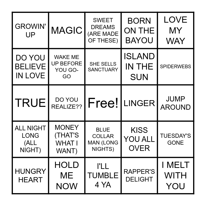 This bingo card has a free space and 54 words: 99 LUFTBALLOONS, ALL NIGHT LONG (ALL NIGHT), BABE, THE BEST OF TIMES, BLUE COLLAR MAN (LONG NIGHTS), BLUE MONDAY, BORN ON THE BAYOU, CARRY ON WAYWARD SON, DO YOU BELIEVE IN LOVE, EVERYBODY WANTS TO RULE THE WORLD, GROWIN' UP, HEART OF GLASS, HOLD ME NOW, HUNGRY HEART, IF I CAN'T HAVE YOU, I'LL TUMBLE 4 YA, I MELT WITH YOU, ISLAND IN THE SUN, JUMP, JUMP AROUND, KISS YOU ALL OVER, LADIES NIGHT, LINGER, LOVE MY WAY, LOVE STINKS, MAGIC, MATERIAL GIRL, MY BEST FRIEND'S GIRL, PASS THE DUTCHIE, RAPPER'S DELIGHT, RENEGADE, ROCK 'N' ROLL (PART 2), STRANGE BREW, THE STROKE, SWEET DREAMS (ARE MADE OF THESE), TOO SHY, TRUE, TUESDAY'S GONE, VIDEO KILLED THE RADIO STAR, WAKE ME UP BEFORE YOU GO-GO, WHITE WEDDING - PT 1, WOULDN'T IT BE NICE, YOU MAKE MY DREAMS (COME TRUE), YOU SPIN ME ROUND (LIKE A RECORD), MONEY (THAT'S WHAT I WANT), WOOLY BULLY, ENDLESS LOVE, WE'VE ONLY JUST BEGUN, SHE SELLS SANCTUARY, DO YOU REALIZE??, SPIDERWEBS, LOVE SONG, COULD YOU BE LOVED and ANOTHER DAY.