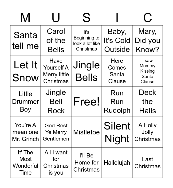 This bingo card has a free space and 30 words: All I want for Christmas is you, Santa Baby, Jingle Bell Rock, Rockin' around the Christmas tree, Santa tell me, It's Beginning to look a lot like Christmas, Have Yourself A Merry little Christmas, Mistletoe, Run Run Rudolph, I'll Be Home for Christmas, Deck the Halls, Last Christmas, Hallelujah, Frosty the Snowman, I saw Mommy Kissing Santa Clause, 12 Days of Christmas, Silent Night, You're A mean one Mr. Grinch, God Rest Ye Merry Gentlemen, Mary, Did you Know?, Little Drummer Boy, Do You Hear What I Hear?, Carol of the Bells, Here Comes Santa Clause, Let It Snow, Baby, It's Cold Outside, A Holly Jolly Christmas, It' The Most Wonderful Time, Jingle Bells and Rudolph The Red-Nosed Reindeer.