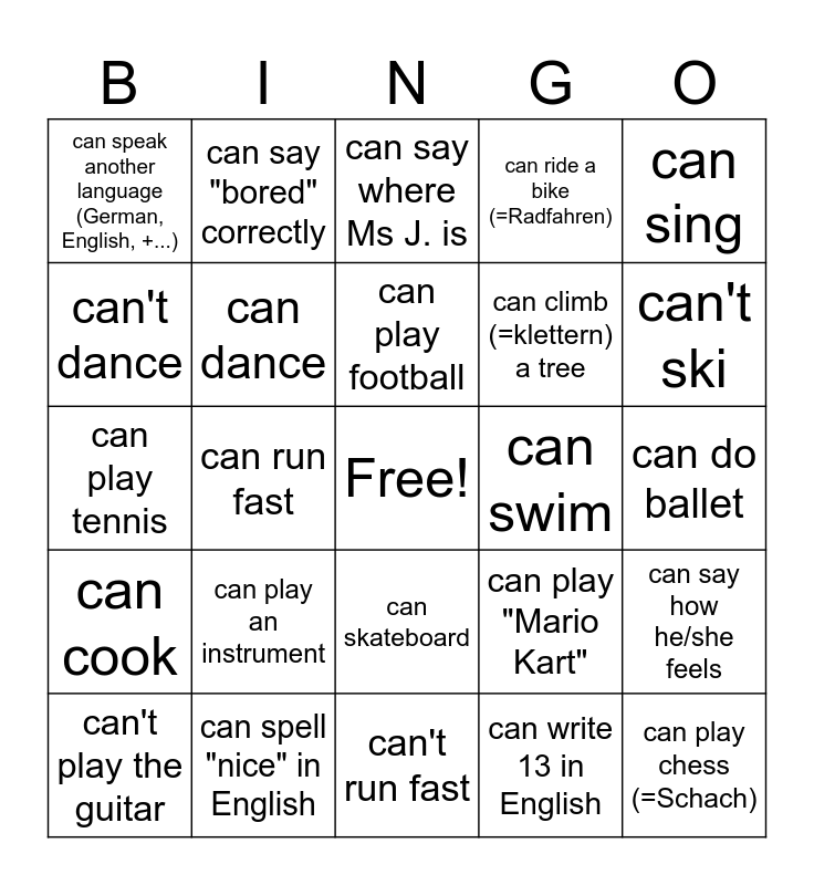 This bingo card has a free space and 24 words: can play an instrument, can spell "nice" in English, can play football, can't play the guitar, can sing, can speak another language (German, English, +...), can't dance, can say "bored" correctly, can swim, can skateboard, can climb (=klettern) a tree, can play tennis, can play "Mario Kart", can say how he/she feels, can dance, can write 13 in English, can do ballet, can say where Ms J. is, can't ski, can run fast, can play chess (=Schach), can cook, can ride a bike (=Radfahren) and can't run fast.