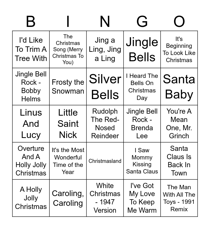 This bingo card has 51 words: Have Yourself A Merry Little Christmas, Rudolph The Red-Nosed Reindeer, Let It Snow, Let It Snow, Let It Snow, White Christmas - 1947 Version, It's the Most Wonderful Time of the Year, Rockin' Around The Christmas Tree, The Christmas Song (Merry Christmas To You), Sleigh Ride, Jingle Bell Rock - Bobby Helms, Happy Holidays/The Holiday Season, Frosty the Snowman, Jingle Bells, Santa Claus Is Back In Town, I Saw Mommy Kissing Santa Claus, Christmas (Baby Please Come Home), Mele Kalikimaka, Silver Bells, Jingle Bell Rock - Brenda Lee, It's a Marshmallow World, It's Beginning To Look Like Christmas, Little Saint Nick, I've Got My Love To Keep Me Warm, I'd Like To Trim A Tree With, I Heard The Bells On Christmas Day, The First Noel, The Man With All The Toys - 1991 Remix, Santa Baby, (There's No Place Like) Home For The Holidays, A Holly Jolly Christmas, Jing a Ling, Jing a Ling, Mistletoe and Holly, Hark! The Herald Angels Sing, Twelve Days Of Christmas, The Christmas Waltz, Deck the Hall with Boughs of Holly, Caroling, Caroling, The Merriest, Happy Holiday, Blue Christmas, I Believe, You're A Mean One, Mr. Grinch, Overture And A Holly Jolly Christmas, Up On The House Top (Ho Ho Ho), O Tannenbaum, The Little Drummer Boy, Do You Hear What I Hear?, Linus And Lucy, Silver And Gold, O Holy Night, Christmasland and Run Rudolph Run.