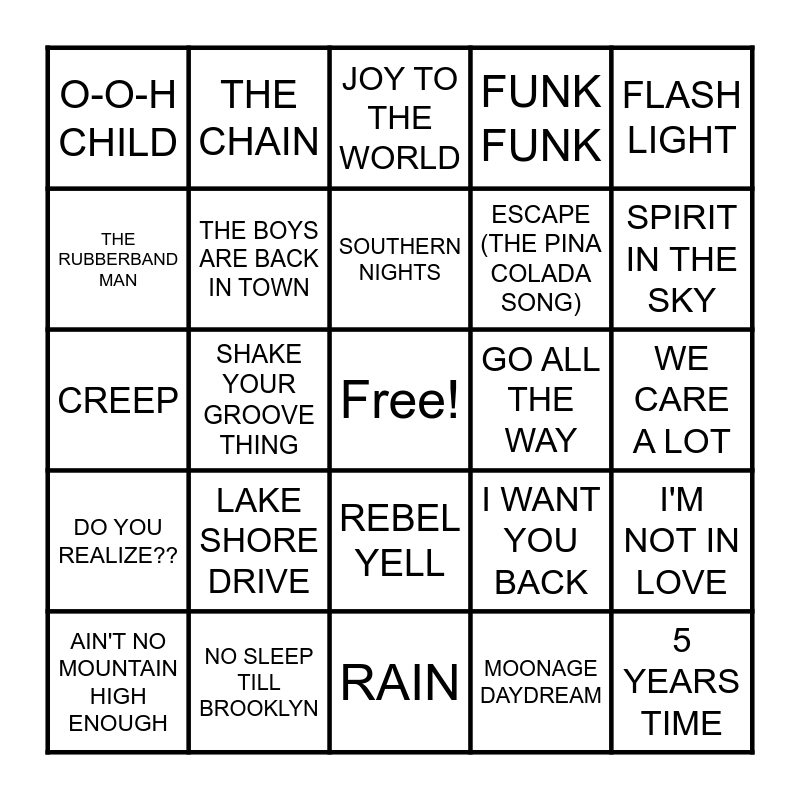 This bingo card has a free space and 51 words: PUNKROCKER, 5 YEARS TIME, WHISTLE FOR THE CHOIR, RAIN, LAKE SHORE DRIVE, OH NO!!!, THE CHAIN, BRANDY (YOU'RE A FINE GIRL), THE RUBBERBAND MAN, FATHER AND SON, THE BOYS ARE BACK IN TOWN, FUNK FUNK, I'M NOT IN LOVE, I WANT YOU BACK, HOOKED ON A FEELING, MR. BLUE SKY, SOUTHERN NIGHTS, GO ALL THE WAY, FOOLED AROUND AND FELL IN LOVE, FLASH LIGHT, SHAKE YOUR GROOVE THING, MOONAGE DAYDREAM, O-O-H CHILD, ESCAPE (THE PINA COLADA SONG), MY SWEET LORD, SURRENDER, SPIRIT IN THE SKY, FOX ON THE RUN, AIN'T NO MOUNTAIN HIGH ENOUGH, JOY TO THE WORLD, WHAM BAM SHANG-A-LANG, BADLANDS, COME AND GET YOUR LOVE, I WILL DARE, DOG DAYS ARE OVER, NO SLEEP TILL BROOKLYN, THIS IS THE DAY, POOR GIRL, I'M ALWAYS CHASING RAINBOWS, SAN FRANCISCO, WE CARE A LOT, DO YOU REALIZE??, REASONS, IN THE MEANTIME, SINCE YOU BEEN GONE, CRAZY ON YOU, CREEP, DO YA WANNA TASTE IT, TEENAGERS, REBEL YELL and BADOOM.