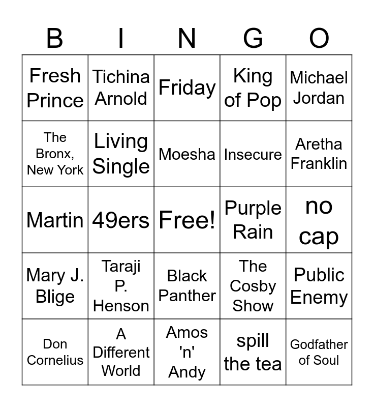 This bingo card has a free space and 29 words: Don Cornelius, Tupac Shakur, 49ers, Madea, Fresh Prince, Friday, Living Single, Taraji P. Henson, Purple Rain, A Different World, no cap, Godfather of Soul, Amos 'n' Andy, spill the tea, Aretha Franklin, Zora Neale Hurston, Black Panther, Mary J. Blige, Michael Jordan, Martin, The Cosby Show, Usain Bolt, Insecure, The Bronx, New York, King of Pop, Tichina Arnold, Public Enemy, Moesha and Eddie Murphy.