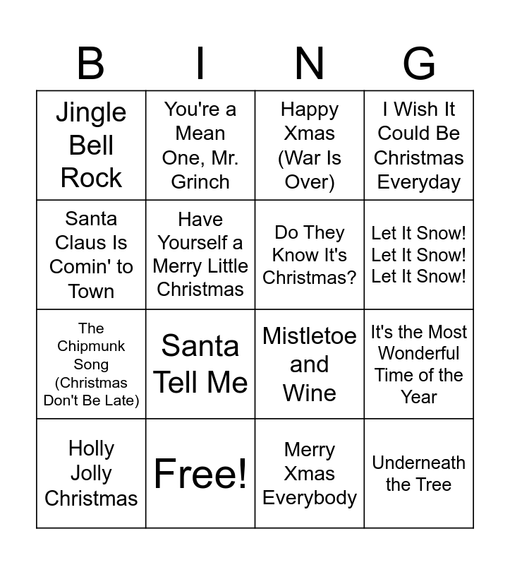This bingo card has 31 words: All I Want for Christmas Is You, Last Christmas, It's the Most Wonderful Time of the Year, Rockin' Around the Christmas Tree, Jingle Bell Rock, Happy Xmas (War Is Over), Do They Know It's Christmas?, Step Into Christmas, Free!, Fairytale of New York, Merry Xmas Everybody, Holly Jolly Christmas, White Christmas, Feliz Navidad, Santa Tell Me, Wonderful Christmastime, It's Beginning to Look a Lot Like Christmas, Blue Christmas, Underneath the Tree, Driving Home for Christmas, Santa Claus Is Comin' to Town, The Christmas Song (Chestnuts Roasting), Sleigh Ride, You're a Mean One, Mr. Grinch, The Chipmunk Song (Christmas Don't Be Late), Have Yourself a Merry Little Christmas, I Wish It Could Be Christmas Everyday, Mistletoe and Wine, I Saw Mommy Kissing Santa Claus, Let It Snow! Let It Snow! Let It Snow! and One More Sleep.