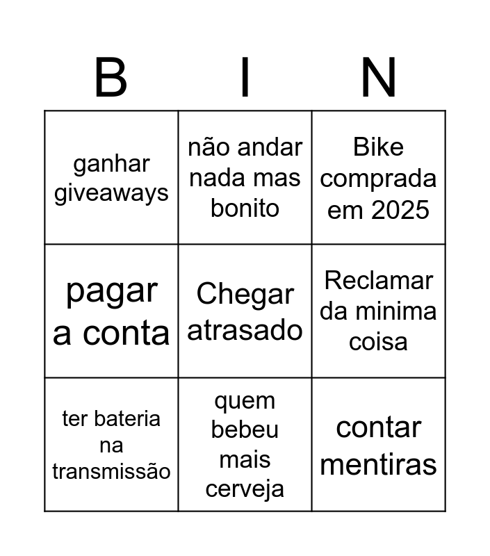 This bingo card has a free space and 8 words: Reclamar da minima coisa, Bike comprada em 2025, não andar nada mas bonito, ter bateria na transmissão, ganhar giveaways, contar mentiras, pagar a conta and quem bebeu mais cerveja.
