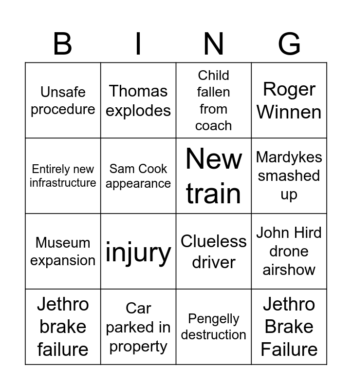 This bingo card has 17 words: Pengelly destruction, Jethro brake failure, Child fallen from coach, Unsafe procedure, injury, Roger Winnen, John Hird drone airshow, New train, Mardykes smashed up, Sam Cook appearance, Car parked in property, Clueless driver, Entirely new infrastructure, Thomas explodes, Museum expansion, Hat stolen and Jethro Brake Failure.