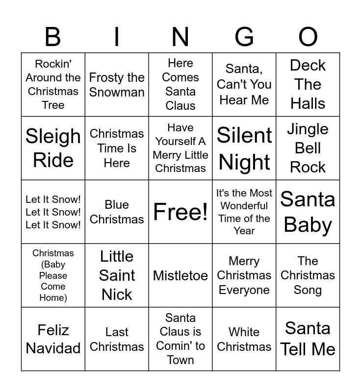 This bingo card has a free space and 33 words: All I Want for Christmas Is You, Baby It’s Cold Outside, Blue Christmas, Carol of the Bells, Christmas (Baby Please Come Home), Christmas Time Is Here, Deck The Halls, Feliz Navidad, Frosty the Snowman, Hallelujah, Have Yourself A Merry Little Christmas, Here Comes Santa Claus, Holly Jolly Christmas, It's Beginning to Look a Lot like Christmas, It's the Most Wonderful Time of the Year, Jingle Bell Rock, Last Christmas, Let It Snow! Let It Snow! Let It Snow!, Little Saint Nick, Merry Christmas Everyone, Mistletoe, O Holy Night, Rockin' Around the Christmas Tree, Santa Baby, Santa Claus is Comin' to Town, Santa Tell Me, Santa, Can't You Hear Me, Silent Night, Sleigh Ride, The Christmas Song, Underneath the Tree, White Christmas and Winter Wonderland.