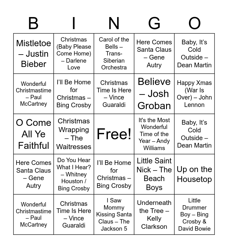 This bingo card has a free space and 48 words: Carol of the Bells – Trans-Siberian Orchestra, Little Drummer Boy – Bing Crosby & David Bowie, O Come All Ye Faithful, I Saw Mommy Kissing Santa Claus – The Jackson 5, Do You Hear What I Hear? – Whitney Houston / Bing Crosby, Mary, Did You Know? – Pentatonix, Christmas (Baby Please Come Home) – Darlene Love, Happy Xmas (War Is Over) – John Lennon, Wonderful Christmastime – Paul McCartney, Mele Kalikimaka – Bing Crosby, I’ll Be Home for Christmas – Bing Crosby, Here Comes Santa Claus – Gene Autry, Up on the Housetop, Little Saint Nick – The Beach Boys, Grandma Got Run Over by a Reindeer – Elmo & Patsy, Silver and Gold – Burl Ives, Christmas Time Is Here – Vince Guaraldi, It's the Most Wonderful Time of the Year – Andy Williams, Run Rudolph Run – Chuck Berry, Baby, It’s Cold Outside – Dean Martin, Christmas Wrapping – The Waitresses, Underneath the Tree – Kelly Clarkson, Mistletoe – Justin Bieber, Believe – Josh Groban, Christmas (Baby Please Come Home) – Darlene Love, Happy Xmas (War Is Over) – John Lennon, Wonderful Christmastime – Paul McCartney, Mele Kalikimaka – Bing Crosby, I’ll Be Home for Christmas – Bing Crosby, Here Comes Santa Claus – Gene Autry, Up on the Housetop, Little Saint Nick – The Beach Boys, Grandma Got Run Over by a Reindeer – Elmo & Patsy, Silver and Gold – Burl Ives, Christmas Time Is Here – Vince Guaraldi, It's the Most Wonderful Time of the Year – Andy Williams, Run Rudolph Run – Chuck Berry, Baby, It’s Cold Outside – Dean Martin, Christmas Wrapping – The Waitresses, Underneath the Tree – Kelly Clarkson, Mistletoe – Justin Bieber, Believe – Josh Groban, Carol of the Bells – Trans-Siberian Orchestra, Little Drummer Boy – Bing Crosby & David Bowie, O Come All Ye Faithful, I Saw Mommy Kissing Santa Claus – The Jackson 5, Do You Hear What I Hear? – Whitney Houston / Bing Crosby and Mary, Did You Know? – Pentatonix.