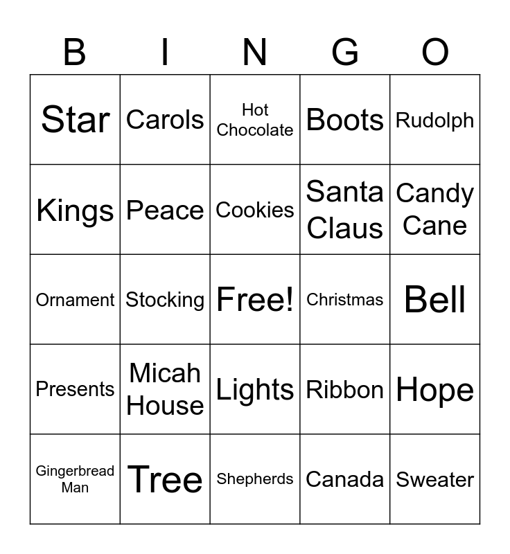 This bingo card has a free space and 38 words: Joy, Mercy, Christmas, Peace, Hope, Micah House, Cookies, Sleigh, Rudolph, Santa Claus, Stocking, Boots, Sweater, Bell, Kings, Presents, Snow, Hot Chocolate, Hamilton, Christmas, Star, Tree, Candy Cane, Gingerbread Man, North Pole, Shepherds, Frost, Angels, Chimney, Elf, Jingle, Lights, Canada, Carols, Gold, Ribbon, Ornament and Candle.