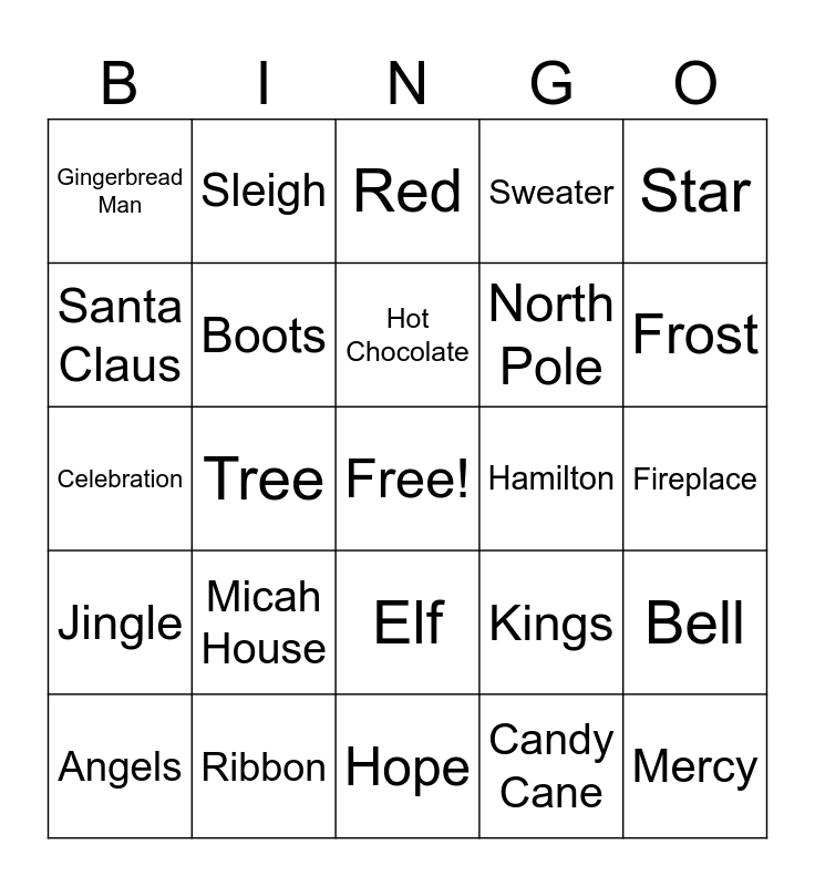 This bingo card has a free space and 49 words: Joy, Mercy, Peace, Hope, Micah House, Cookies, Sleigh, Rudolph, Santa Claus, Stocking, Boots, Sweater, Bell, Kings, Presents, Snow, Hot Chocolate, Hamilton, Christmas, Star, Tree, Candy Cane, Gingerbread Man, North Pole, Shepherds, Frost, Angels, Chimney, Elf, Jingle, Lights, Canada, Carols, Gold, Ribbon, Ornament, Candle, Green, Fireplace, Holly, Cozy, Merry, Peppermint, Manger, Celebration, Red, Mittens, Pie and Hat.