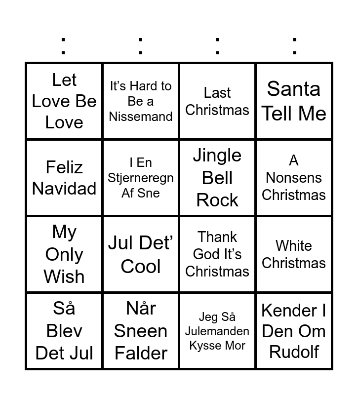 This bingo card has 29 words: Driving Home for Christmas, Mistletoe, White Christmas, All I Want for Christmas, Let Love Be Love, Last Christmas, Jingle Bell Rock, Santa Lucia, Når Sneen Falder, Når Du Ser Et Stjerneskud, Jeg Så Julemanden Kysse Mor, Så Blev Det Jul, Jul På Vesterbro, Søren Banjomus, Jul Det’ Cool, Det er Risengrød, Der’ Noget I December, Kender I Den Om Rudolf, Feliz Navidad, Thank God It’s Christmas, Let It Snow, Jul i Angora, My Only Wish, I En Stjerneregn Af Sne, Santa Tell Me, It’s Hard to Be a Nissemand, Til Julebal I Nisseland, A Nonsens Christmas and Juletræet Med Sin Pynt.