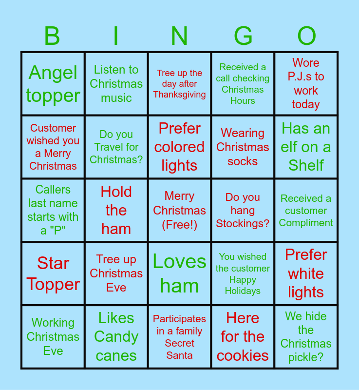 This bingo card has a free space and 24 words: Tree up Christmas Eve, Likes Candy canes, Prefer colored lights, Working Christmas Eve, Wore P.J.s to work today, Angel topper, Customer wished you a Merry Christmas, Listen to Christmas music, Do you hang Stockings?, Loves ham, Wearing Christmas socks, Callers last name starts with a "P", You wished the customer Happy Holidays, Prefer white lights, Do you Travel for Christmas?, Here for the cookies, Received a customer Compliment, Tree up the day after Thanksgiving, Has an elf on a Shelf, Hold the ham, We hide the Christmas pickle?, Star Topper, Received a call checking Christmas Hours and Participates in a family Secret Santa.